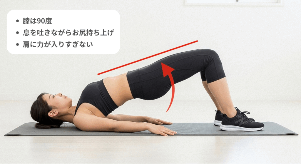 ブリッジは、産後ママに特におすすめのピラティスエクササイズです。お尻や太ももの裏だけでなく、体幹全体を使うことで、姿勢改善や腰痛予防にも効果があります。