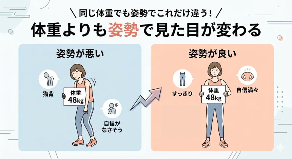 見た目の印象を大きく左右するのは、体重よりも姿勢です。